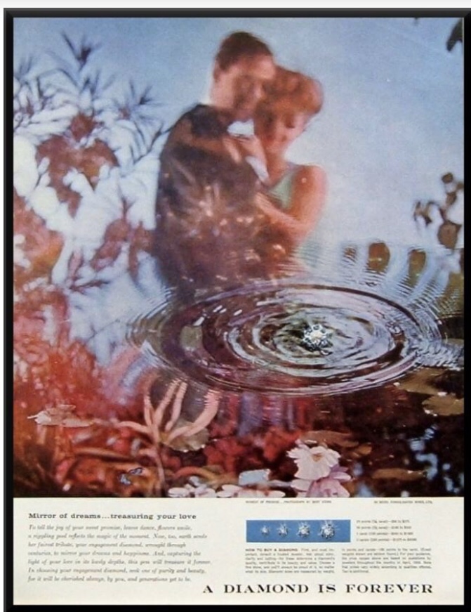 De Beers,’in bu durumu aşmak için yaptığı manevra halen geçerliliğini koruyan bir ritüele dönüştü: N.W. Ayer isimii reklam firmasıyla, 1938 yılında bir anlaşma yaptılar. Bu reklam şirketi, geniş bir anket çalışmasını yolunu belirlemek amacıyla yaptı. Sonuç halkın elması süper zenginlerin alabildiği bir ürün gördüğü ve ona para yatırmaktansa ev, araba almayı daha mantıklı buldukları ortaya çıktı. Bunu kırmak için reklam faaliyetlerini yöneltecekleri harika bir vaha buldular: Aşk ve evlilik! Ünlülerin evlilik tekliflerinde armağan edilen elmas yüzük haberleri, elmas ve aşk ögelerini barındıran şarkılar, hatta romanlar bir anda etrafı sardı. De Beers bu kampanyaya milyon dolarlar yatırdı ancak karşılığını fazlasıyla alarak! Öyle bir algı oluşturuldu ki, pırlanta ve elmas yüzük olmasa evlilik teklifi olmayacaktı! Günümüzde halen kullanılan “diamonds are forever” yani “elmaslar sonsuzdur” sloganı hızla benimsendi.