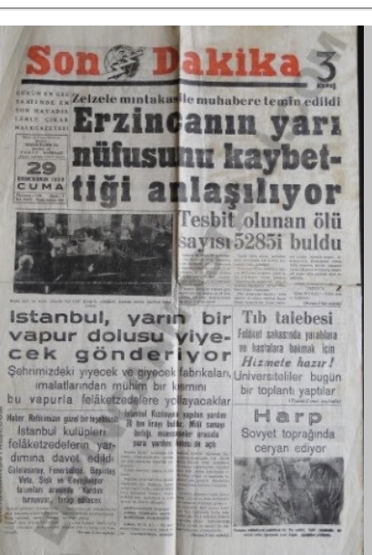 Elifcim kalemine sağlık . 1939 yılından günümüze kadar depreme karşı bir arpa boyu yol alınmadığı ayan beyan ortada böyle ulusal felaketlerde tüm halkın birlik olup el ele verip yaraları sarmaya gönüllü olması yardımlaşma ve birlik olma bizim güzel hasletlerimizden ancak esas hayret verici olan depremin yıkıcı ve ölümcül zararlarına karşı önlem alınmayıp bilimden uzaklaşıp beklenen sonuç ortaya çıkıncada tarih yine tekerrürden ibaret olmakta. Sonuç olarak bilim adamlarının uyarılarına ve çalışmalarına itibar edilmediği , liyakatın olmadığı , hırs , aç gözlülük , inat ve rant ağırlıklı kara günlerden geçmekteyiz. Elin Japonu binalarını depreme uygun yapıyor halkını eğitip öğretiyor tüm sosyal kurumlar ve devlet üzerine düşen tüm görevlerini yapıyor ve 7 şiddetinde olan depremde kimsenin burnu kanamıyor.