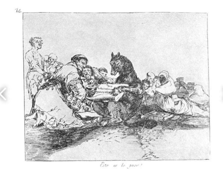 Şeytani bir varlığın dağıttığı kararlara itaat eden, sıraya girip kaderinin ‘açlık, sefalet, hastalık’ olarak açıklanmasını acziyetle bekleyenleri resmettiği bu eserde önemli bir detay var: Kurt şeklinde imgelenen varlık parşömene bir yazı yazıyor: “misera humanidad, la culpa es toya” bunun da manası şöyle: “sefil insanlık, bunlar senin suçun” Altına düştüğü notta demiş ki: Esto es lo peor: bu, en kötüsü!