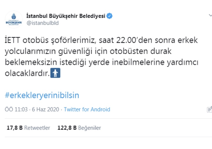 Yakın zamanda, Twitter’da hemcinslerim tarafından ataerkil toplum yapısına, gündelik hayatta, sosyal medyada maruz kaldıkları “eril dil”e karşı ironi dolu bir akım başlattılar. Kadınlara atfen söylenilen sözleri çevirip özneyi erkek yaptılar. Okurken bayağı da eğlendim. “Erkek dediğin herkesin içinde kahkaha atmayacak”, “Erkek kısmı az konuşur”, “Kocam isterse çalışır”, “Evlenilecek erkek vardır, eğlenilecek erkek vardır” v.s Hatta İstanbul Büyükşehir Belediyesi de bu mizahi harekete destek vererek şöyle bir şey paylaştı.