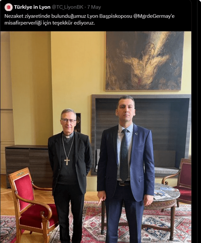 Örnekleri çeşitlendirmek ve çoğaltmak mümkün. Burada dikkat edilmesi gereken nokta, bu sembollere genelde rekabet ya da düşman ülkeler/toplumlar/gruplar arasında yaşanan huzursuzluk dönemlerinde başvurulur. Dün Lyon’daki Türk konsolosluğu (gelen tepkiler sonrasında kaldırdığı) Lyon başpiskoposuna yapılan ziyaretin fotoğrafını paylaştı.